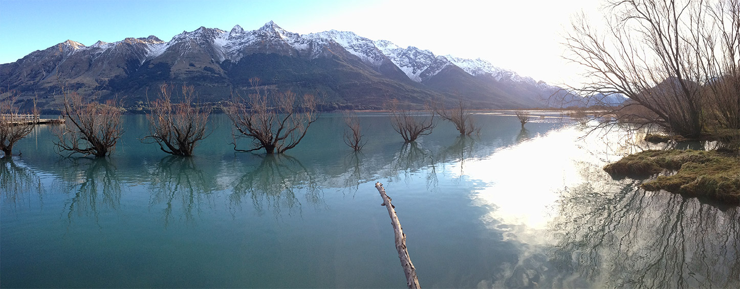 Arriving at Glenorchy for the golden hour was tricky given that the sky was bleak with pale clouds flattened out by a garish glare that smashed all hopes of textured shadows. I settled for a few dismal shots of these clusters of willows anchored in the lake like sirens silently screaming for help.